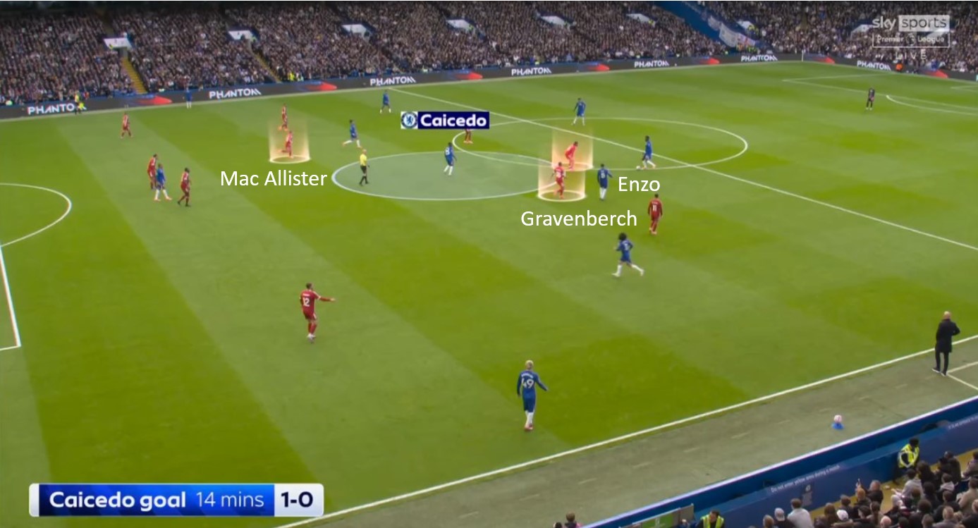 ဒါ့အပြင်ပထမပိုင်း (၁၄) မိနစ်မှာ သွင်းယူပေးခဲ့တဲ့ အဖွင့်ဂိုးဟာလည်း အရမ်းကိုလှပပါတယ်..။ ချယ်လ်ဆီးအသင်းဟာ လီဗာပူးလ်အသင်းရဲ့ ကွင်းလယ်ကစားပုံကို သေသေချာချာ လေ့လာထားခဲ့ပါတယ်..။ ဂရာဗင်ဘတ်ချ် ဟာ ‘No. 6’ နေရာမှာ အများဆုံးနေရာယူလေ့ ရှိပေမယ့် အခုဂိုးပေးလိုက်ရတဲ့ အခိုက်အတန့်မှာ အင်ဇို ဖာနန်ဒက်စ် ရဲ့ အနားမှာ ရှိနေပါတယ်..။ မက္ကလစ္စတာ ဟာ တောင်ပံဘက်ကို ရောက်နေတာကြောင့် ကိုင်ဆီဒို ဟာ နေရာလွတ် ရခဲ့ပါတယ်..။ သူ့ဆီကို ဘောလုံးရောက်လာတဲ့အချိန် မက္ကလစ္စတာ ဟာ လုယူနိုင်ဖို့ ကြိုးစားခဲ့ပေမယ့် အီကွေဒေါ ကွင်းလယ် ကစားသမားဟာ ပါးပါးနပ်နပ်နဲ့ လှည့်ထွက်သွားခဲ့တာကြောင့် နောက်ကျသွားခဲ့ပါတယ်..။