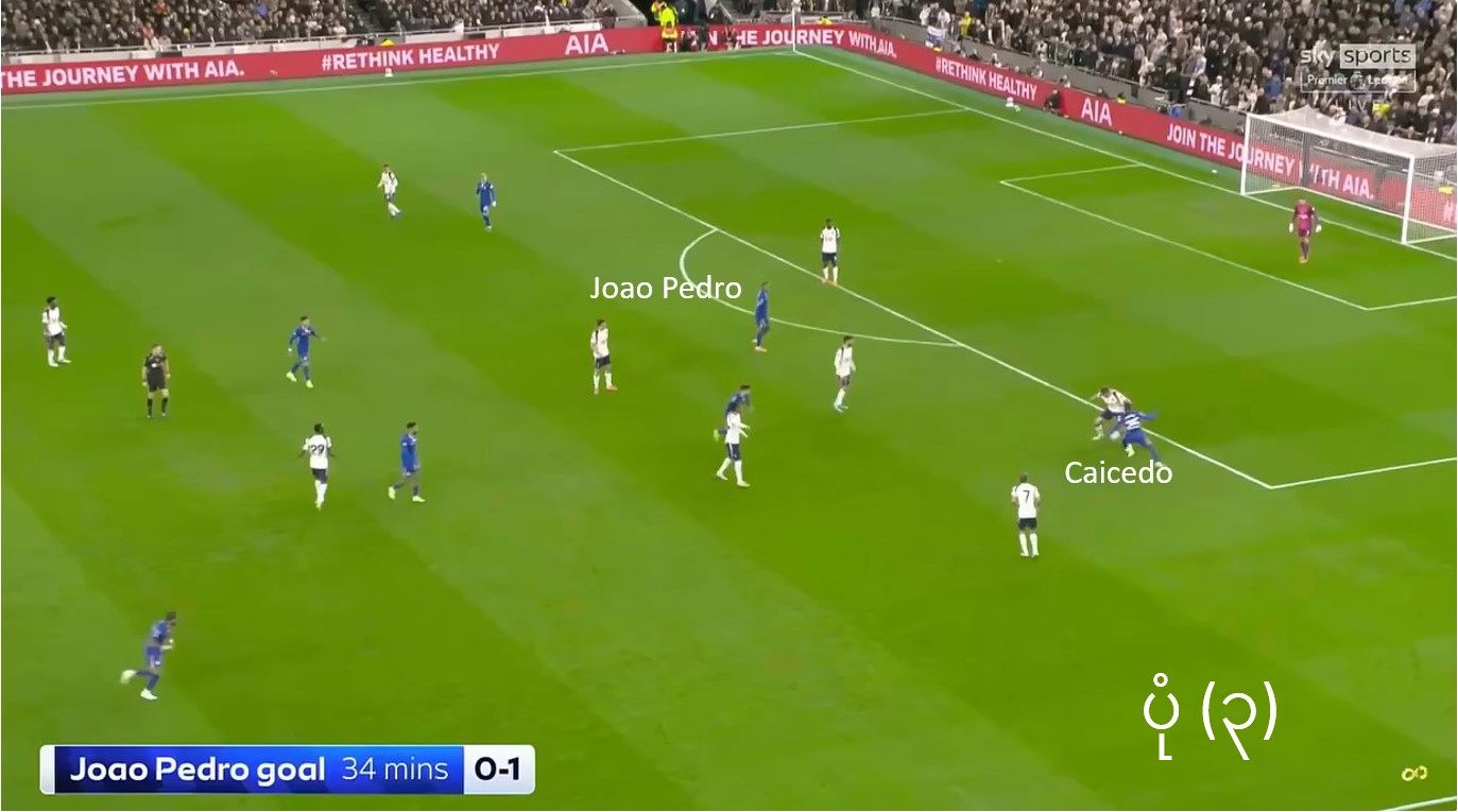 အဲဒီဘောလုံးကို သူ့ရဲ့အနားမှာရှိနေတဲ့ ပီဒရို နက်တို က ဂျာအို ပီဒရို ရဲ့ ပြေးလမ်းကြောင်းထဲကို ချပေးပါမယ်..(ပုံ- ၂)။ ဒါပေမယ့် ဂျာအို ပီဒရို ရဲ့ ခန္ဓာကိုယ်အနေအထားကို ကြည့်မယ်ဆိုရင် သူ့ရဲ့ပြေးလမ်းထဲ ဘောလုံးရောက်လာမှာကို မျှော်လင့်ထားပုံ မရပါဘူး..။