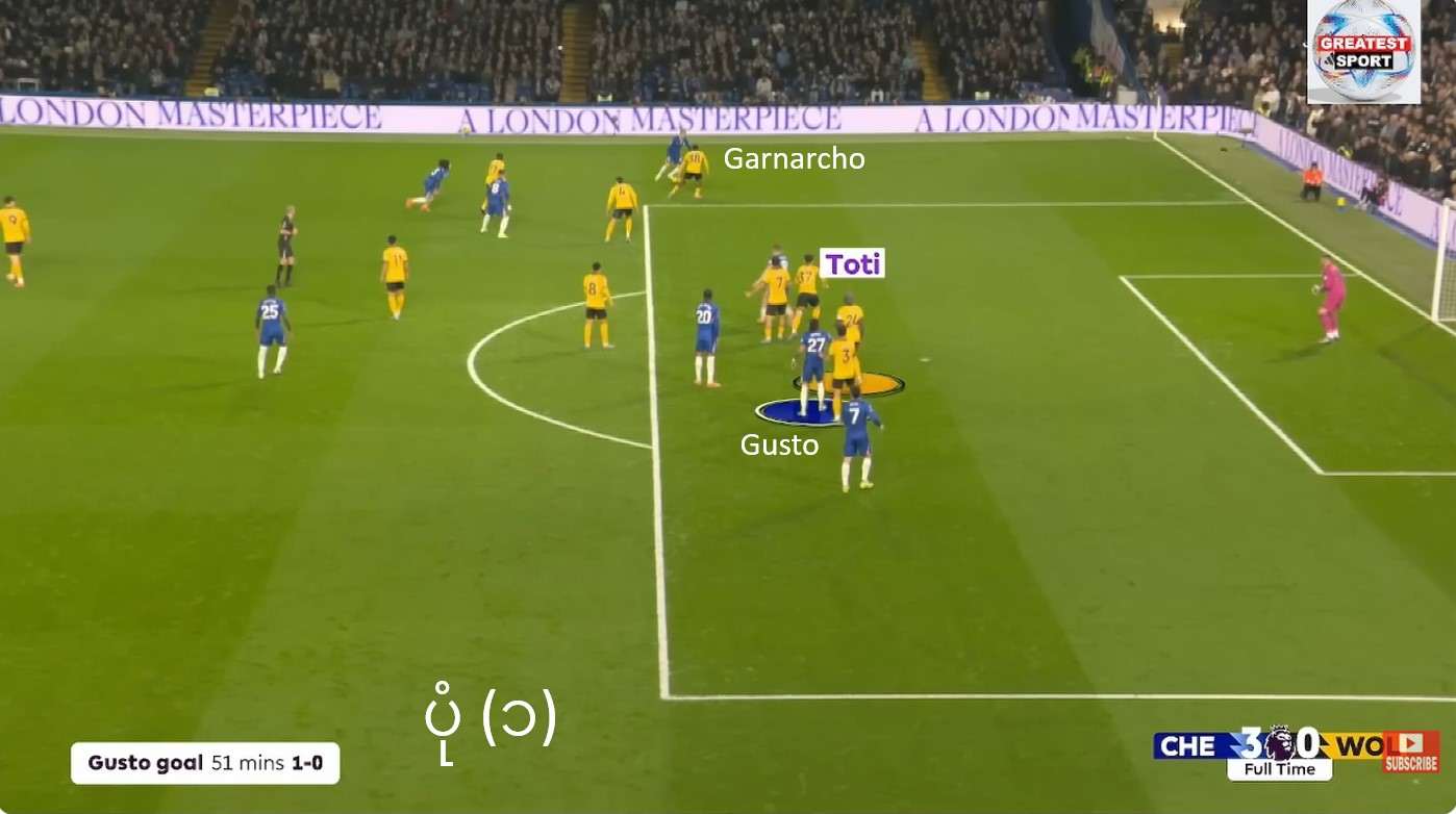 မာလို ဂူစ်တို ကလည်း အဝေးဂိုးတိုင်မှာ အသင့်ရှိနေပြီး လွတ်လွတ်ကျွတ်ကျွတ် အနီးကပ်ခေါင်းတိုက်ခွင့် ရသွားတာဆိုတော့ ဘယ်လိုနည်းနဲ့မှ မလွဲနိုင်တော့ဘူး..။ အဲဒီဂိုးမှာ ဝုလ်ဖ်အသင်းက ဗဟိုခံစစ်မှူးတွေရဲ့ နေရာယူထားတဲ့ အနေအထားကို ပြောချင်ပါတယ်..။ ပထမတစ်ကြိမ် ဂါနာချို က ဘယ်ခြေနဲ့ဖြတ်တင်မယ့်ပုံစံ ပြုလုပ်လိုက်တဲ့အချိန် တော့တီ ဂိုးမက်စ် က ဂူစ်တို နားမှာ ရှိနေပါတယ်..။ ဒါပေမယ့်သူ့ရဲ့ခန္ဓာကိုယ် အနေအထားကို ကြည့်မယ်ဆိုရင် နောက်ကျောဘက်မှာရှိနေတဲ့ တိုက်စစ်မှူးတွေဘက်ကို ပြန်လှည့်နိုင်အောင် ပြင်ဆင်ထားတာမရှိပဲ (never body opened) ဘောလုံးကိုပဲ မျက်နှာမူထားပါတယ်.(ပုံ- ၁).။