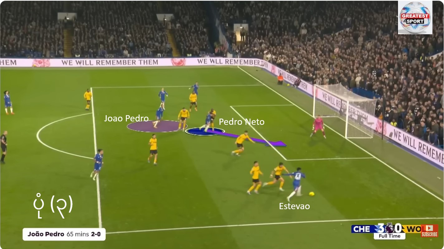 အက်စ်တီဗာအို ဖြတ်တင်လိုက်တဲ့အချိန် ပီဒရို နက်တို ဟာ အနီးဂိုးတိုင်ဘက်ကို ဖြတ်ပြေးပြီး နောက်ခံလူ ဂိုးမက်စ် ကို ဆွဲထုတ်သွားခဲ့တာကြောင့် ဂျာအို ပီဒရို အတွက် နေရာလွတ် ရလာခဲ့ပါတယ်...။ နောက်ပြီးဂျာအို ပီဒရို ဟာ ဂိုးသမားဆီကို ပြေးသွားမယ့်အယောင်ပြပြီး နောက်ခံလူကို အသာလေး တွန်းလိုက်တာကြောင့် ကန်သွင်းနိုင်မယ့် အနေအထားကို ပါးပါနပ်နပ် ဖန်တီးနိုင်ခဲ့ပါတယ်..(ပုံ - ၃)။