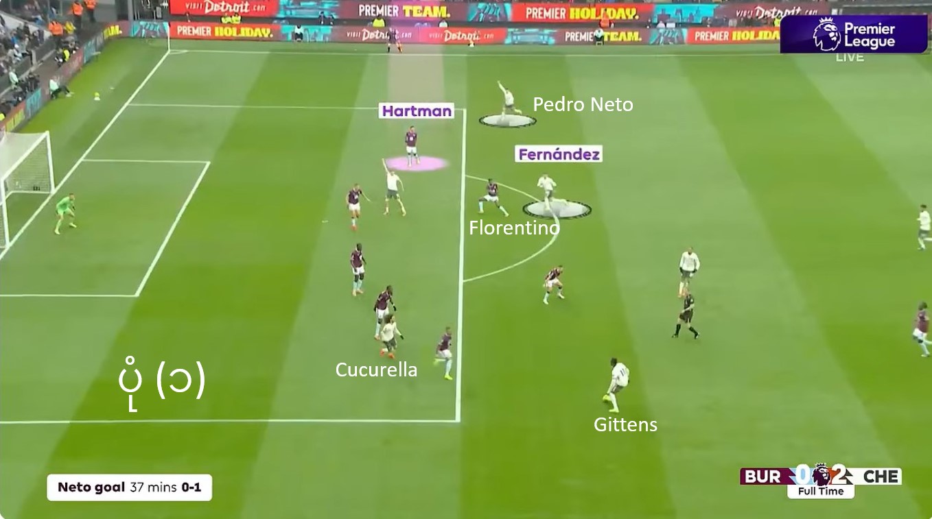 ပွဲချိန် (၃၇) မိနစ်မှာ ရရှိသွားခဲ့တဲ့ဂိုးဟာ ချယ်လ်ဆီးအသင်း နောက်တန်းကနေ ဘန်လေအသင်းရဲ့ ခံစစ်ကြောင်းရဲ့နောက်ကို ချပေးလိုက်တဲ့ဘောလုံးကို မာ့စ် ကူကူရယ်လာ က အတင်းလိုက် ဆယ်ကူပြီး နောက်ကိုခင်းပေးလိုက်တာကနေ စတင်ပါတယ်..။ မာ့စ် ကူကူရယ်လာ ရဲ့ နောက်တန်းလူတွေကြားထဲကနေ ပါးပါးနပ်နပ် ပြေးထွက်ပုံနဲ့ သူ့ရဲ့နောက်ကို တောက်လျှောက်လိုက်ပါလာတဲ့ အူဂိုချူကူး နဲ့ ဗဟိုနောက်ခံလူ တူရန်ဇဘီ တို့ရဲ့ကြားထဲကနေ ဘောလုံးရအောင် ဆယ်ယူလိုက်တဲ့ hold up play အတော့်ကို ကောင်းပါတယ်..။ ဂျေမီ ဂစ်တန်စ် ရဲ့ ဖြတ်တင်ဘောကလည်း တကယ့်ကို ကောင်းမွန်ခဲ့တယ်..၊ ပီဒရို နက်တို ရဲ့ ခေါင်းတိုက်ချက်ကလည်း လှပ၊ သပ်ရပ်ခဲ့ပါတယ်..။ ဒါပေမယ့် ဘန်လေအသင်းက နောက်ခံလူ ဟာ့တ်မန်း အနေနဲ့ အခုထက်ပိုကောင်းအောင် ဖျက်ထုတ်နိုင်ခဲ့သင့်တယ်.. လို့ ခင်ဗျားမထင်မိဘူးလား..? ဂယ်ရီ ရေ..