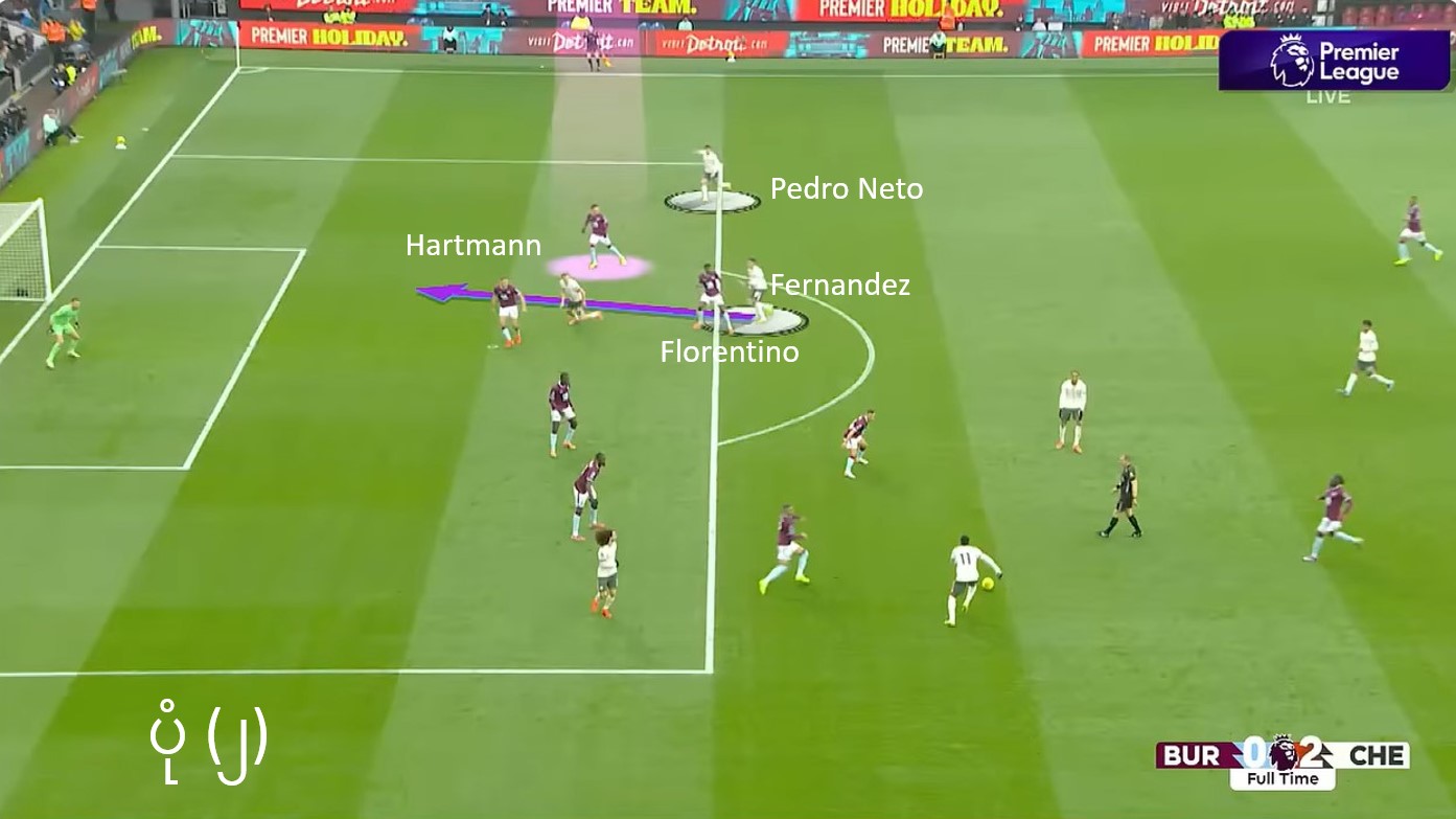 ဂယ်ရီ ကာဟေးလ် - ဂစ်တန်စ် ရဲ့ ဖြတ်တင်ဘော ရောက်လာချိန် ဟာ့တ်မန်း ဟာ သူ့ရဲ့နားမှာ ပီဒရို နက်တို နဲ့ အင်ဇို ဖာနန်ဒက်စ် နှစ်ယောက်ရှိနေတော့ တစ်ယောက်ကိုပဲ ရွေးရပါတော့မယ်..။ အဲဒါနဲ့သူဟာ အနီးဆုံးမှာရှိနေတဲ့ အင်ဇို ဖာနန်ဒက်စ် ကိုပဲ လူကပ်လိုက်ဖို့ ရွေးချယ်လိုက်ပုံရတယ်ဗျ..။ ဂိုးဧရိယာထဲကို အင်ဇို ဖာနန်ဒက်စ် နဲ့ ဆက်ပြီးလိုက်ပါဖို့ တကယ်တမ်းတာဝန်ရှိတာက ကွင်းလယ်က ဖလော်ရင်တီနာ ဗျ..(ပုံ- ၁)။ သူသာဆက်ပြီး လိုက်ပါခဲ့မယ်ဆိုရင် ဟာ့တ်မန်း အတွက် အခုထက်ပိုပြီး လွယ်ကူခဲ့ပါလိမ့်မယ်..။ ဒါပေမယ့် ဂစ်တန်စ် ရဲ့ ဖြတ်တင်ဘောကိုတော့ ချီးမွမ်းရမှာပါ..။ ပွဲအဖြေကိုပြောင်းလဲပေးနိုင်တဲ့ ပေးပို့မှုဆိုတာ အခုလိုဖြတ်တင်ဘောတွေကို ညွှန်းဆိုရမှာပါပဲ..။
