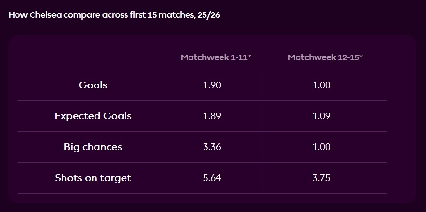 ချယ်လ်ဆီးအသင်းကတော့ နောက်ဆုံးယှဉ်ပြိုင်ခဲ့တဲ့ (၄) ပွဲမှာ တိုက်စစ်ပိုင်း စွမ်းဆောင်ရည် ကျဆင်းနေတာကို အထက်ဖော်ပြပါ ပူးတွဲပုံပါ အချက်အလက်တွေက ဖော်ပြနေပါတယ်..။ တစ်ပွဲကိုပျမ်းမျှ အပိုင်အခွင့်အရေး (big chances) ဖန်တီးနိုင်မှု (၁) ကြိမ်လောက်ပဲ ရှိနေပြီး ထိရောက်တဲ့ တိုက်စစ်ဆင်မှုတွေ မပြုလုပ်တော့တာ တွေ့ရမှာပါ..။ တိုက်စစ်မှူး လီယန် ဒီလပ် ဒဏ်ရာကြောင့် အနားယူနေရသလို ဂျာအို ပီဒရို ဟာလည်း ဩဂုတ်လနောက်ပိုင်းမှာ ခြေစွမ်းကျဆင်းနေသလို ဖြစ်နေတဲ့အတွက် ကိုးလ် ပါးမား ရဲ့ အချိန်ကိုက် ပြန်လည်ပါဝင်နိုင်မှုဟာ ကစားသမားတွေရဲ့ စိတ်ဓါတ်ပိုင်းကို မြှင့်တင်ပေးနိုင်ရုံသာမက လိုအပ်နေတဲ့ တိုက်စစ်ပိုင်းအားနည်းချက်တွေကိုပါ ဖြည့်ဆည်းပေးနိုင်ပါလိမ့်မယ်..။